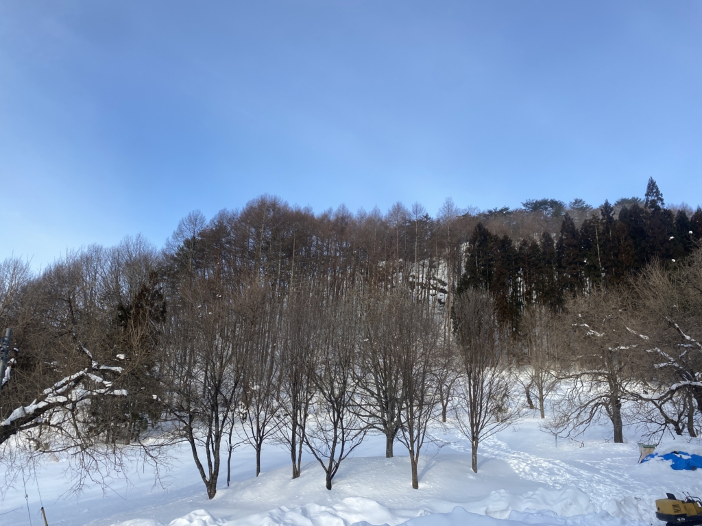 今日も晴れて雪遊び日和です。午前中は裏山をスノーシューで登ってきます。